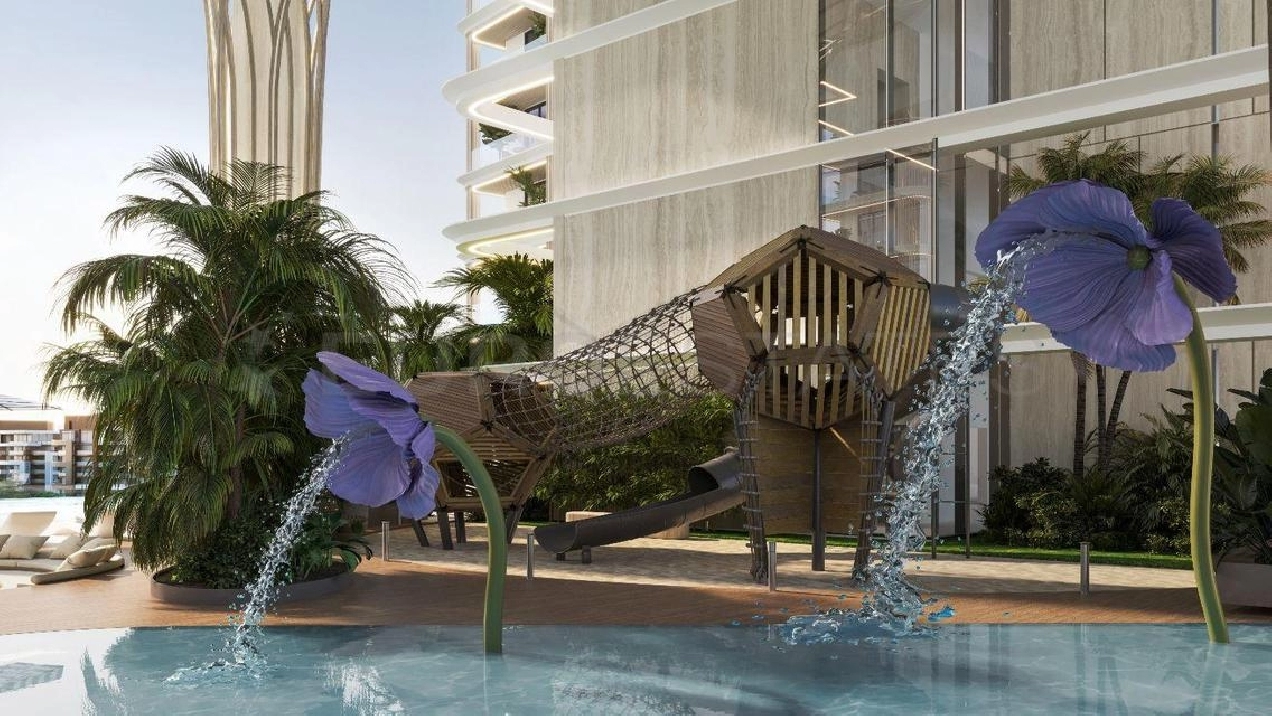 - Children's splash zone, play area, and landscaped park