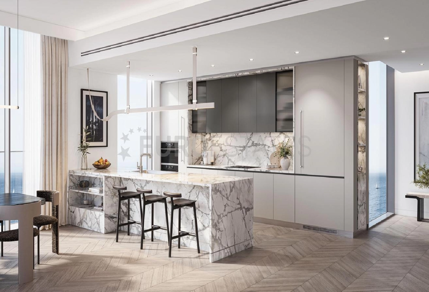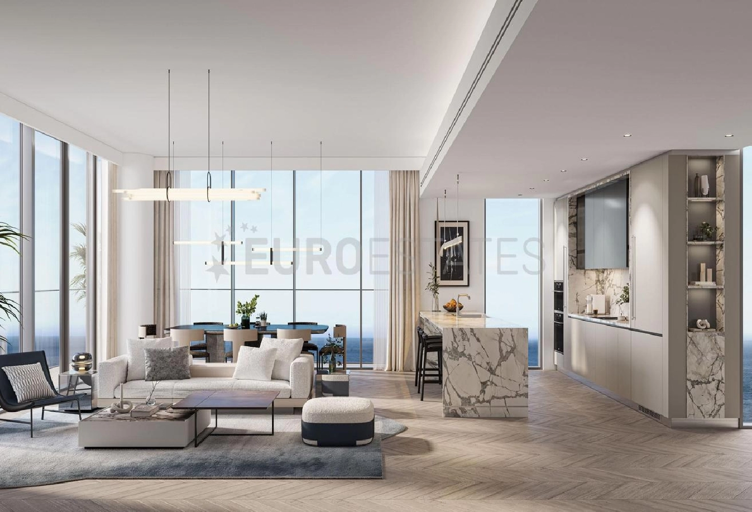 - Open style kitchen: Equipped with high-end appliances and a kitchen bar.
