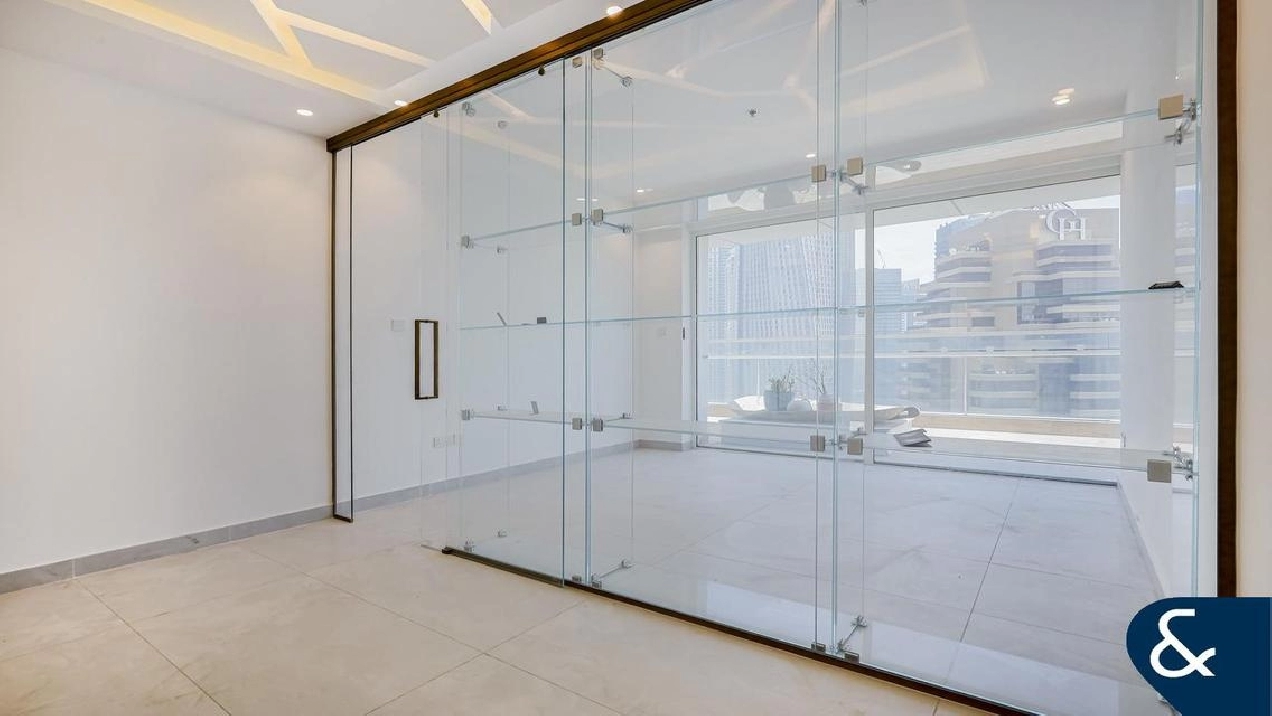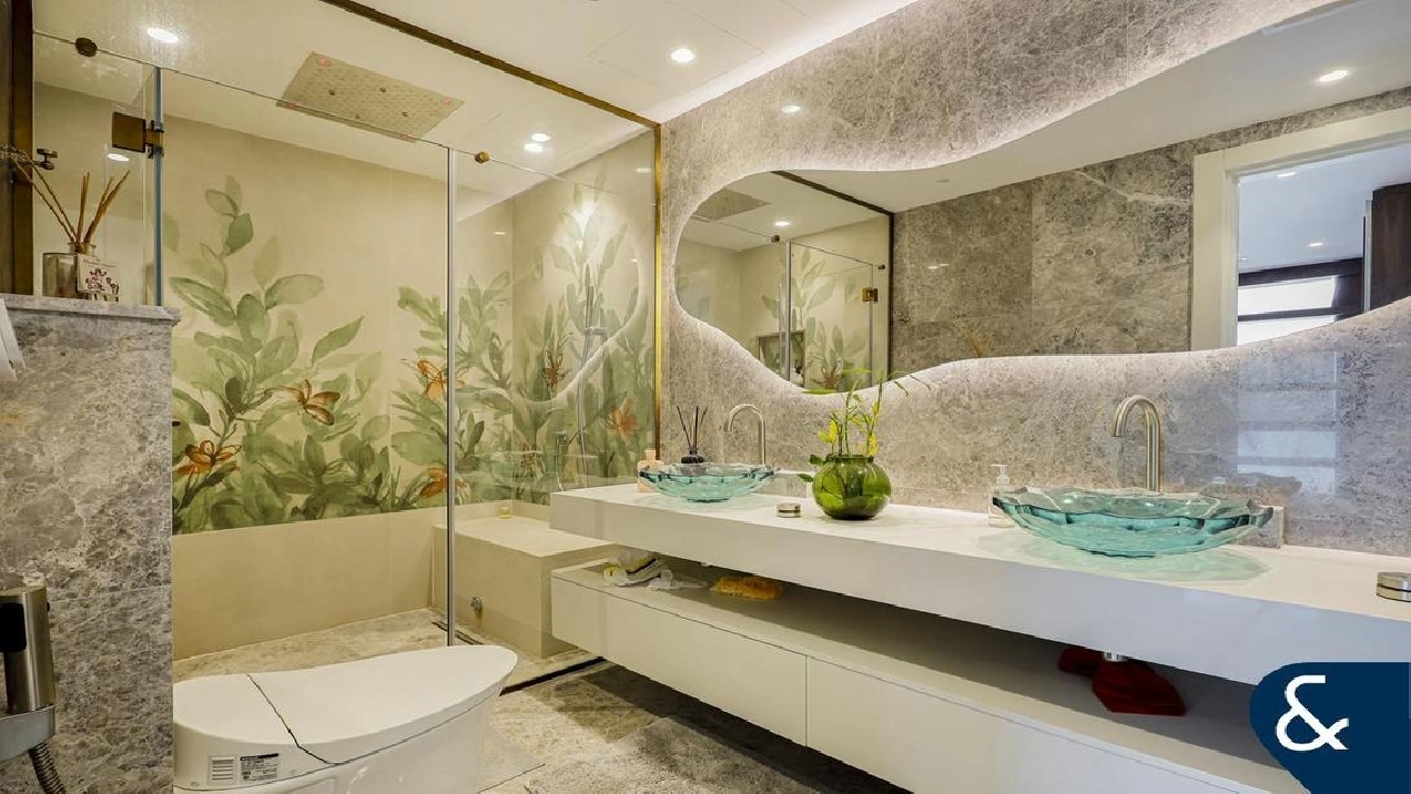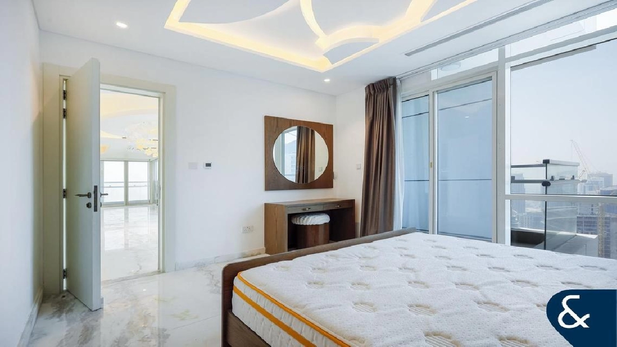 The Master bedroom has been extended and re-modelled to incorporate a spacious dressing room and highly renovated en-suite bathroom. The 2nd and 3rd bedrooms are good sizes with views of Palm Jumeirah and bathrooms ensuite. The 5th bedroom is off the dining room.