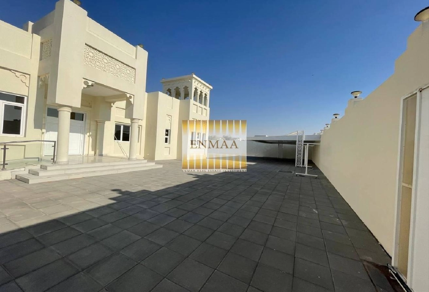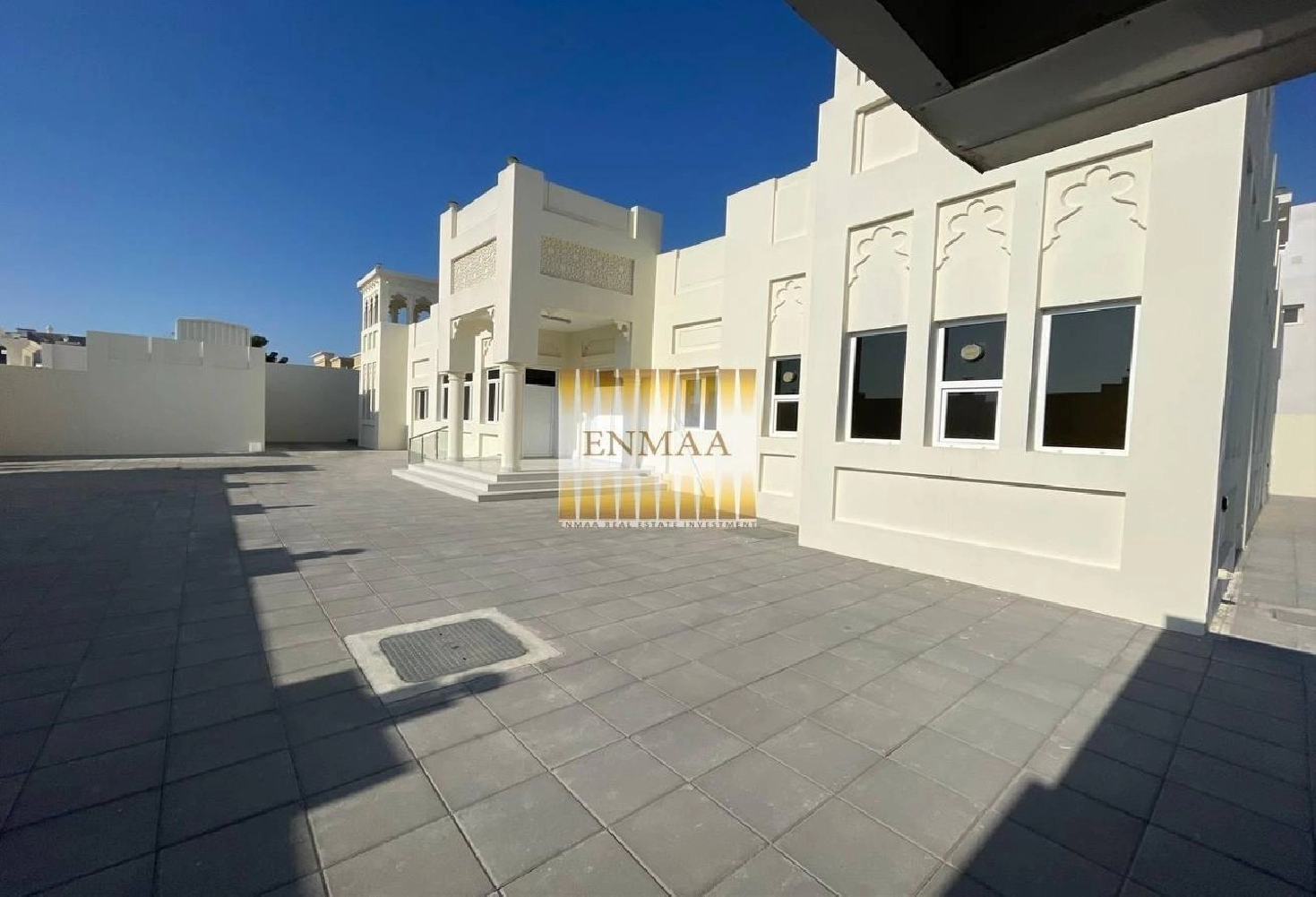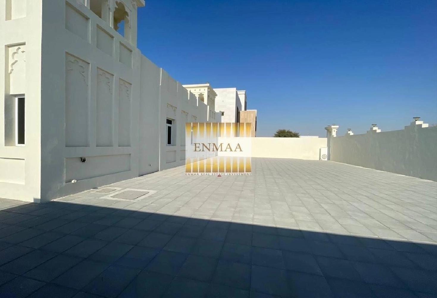 Inside, you’ll find a wide living hall with a pantry kitchen, guest bathroom, and wash area. There’s also a stylish majlis with its own bathroom and wash area.
