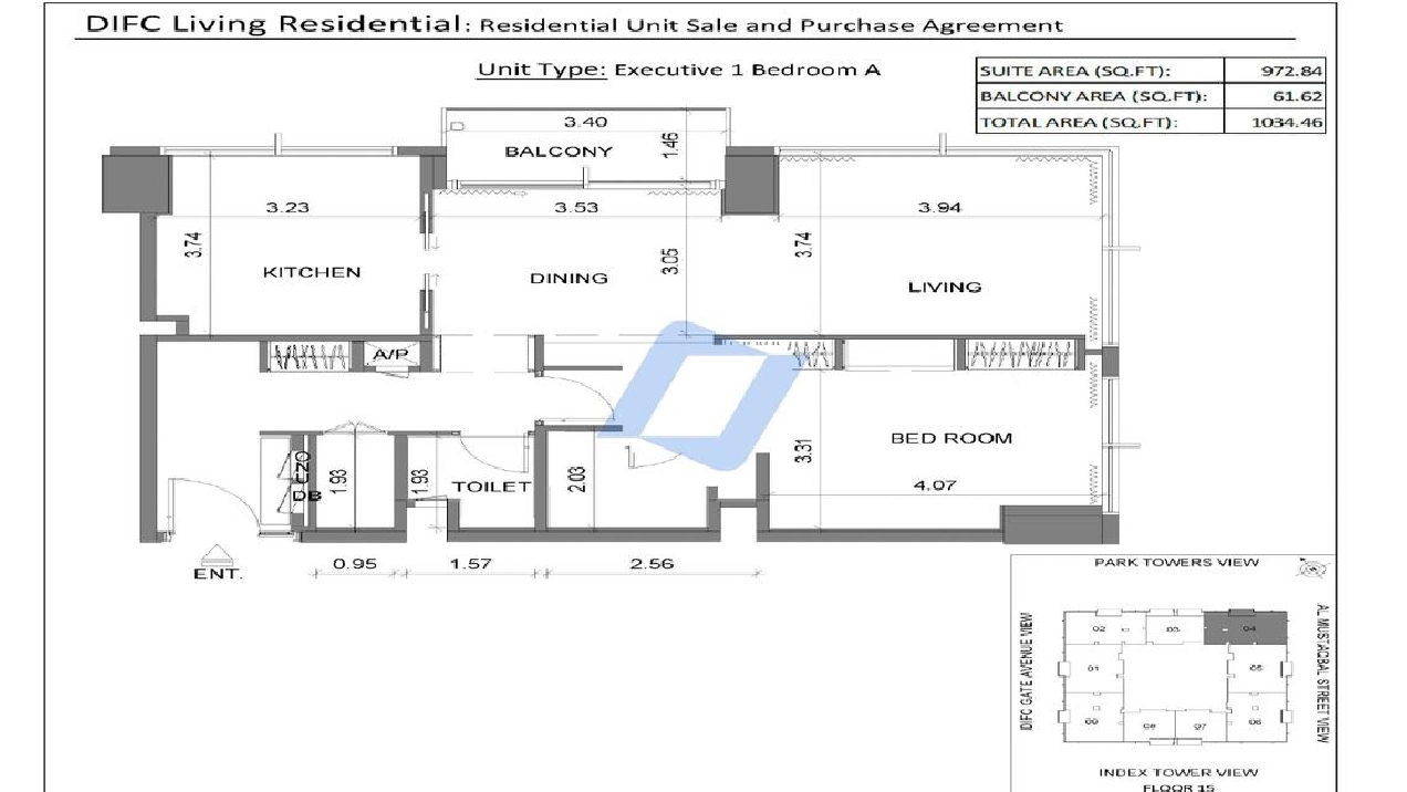 This remarkable Executive 1-Bedroom apartment in DIFC Living offers spacious living with a total area of 1,034.46 sqft. The suite spans 972.84 sqft, complemented by a 61.62 sqft balcony, and boasts stunning corner-unit views of Mustaqbal Street, offering one of the best vistas in the area.